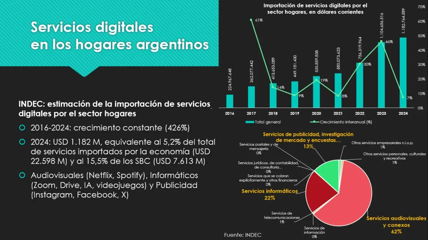 De acuerdo a un documento publicado por el investigador de la Universidad Nacional de General Sarmiento y el CONICET Leandro González, desde que existen registros oficiales, la importación de servicios digitales creció continua y sostenidamente, incluso a tasas interanuales significativamente altas (24% en promedio a lo largo de todo el periodo). En concreto, se pasó de 224 millones de dólares en 2016 a 1.182 millones de dólares en 2024, es decir, un crecimiento del 426% a lo largo de todo el periodo. Y 2025 se encamina a romper la marca con tranquilidad.