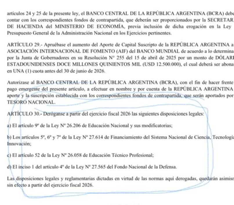 Además, el anteproyecto incluye la derogación del artículo 9º de la Ley de Educación Nacional, que establecía un piso del 6% del PBI destinado a educación, y elimina las metas de financiamiento progresivo en ciencia y tecnología.