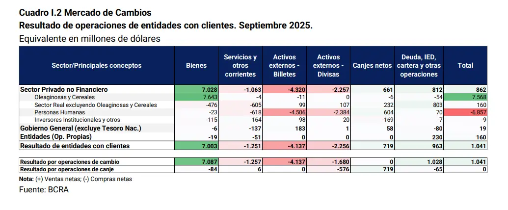 En paralelo al rescate ideado por Caputo junto a los sojeros – rescate que duró pocos días-, la salida de divisas fue permanente. Durante septiembre, las “Personas humanas” registraron egresos netos por 6.857 millones de dólares, principalmente por compras netas de billetes y divisas sin fines específicos por USD 6.890 millones.