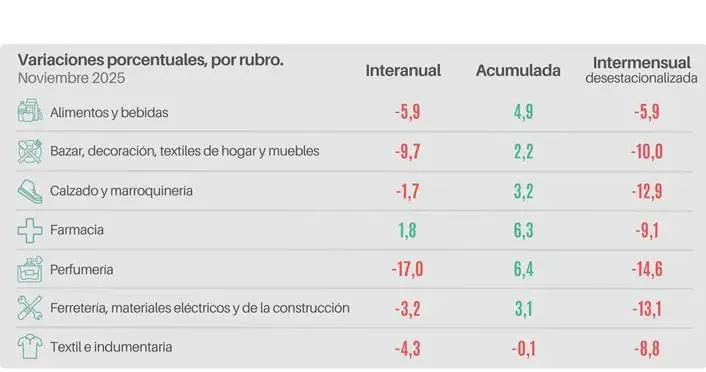 El desglose de los datos reveló un escenario generalizado de contracción con seis de los siete rubros relevados cerraron en rojo. Los sectores más golpeados fueron Perfumería (-17%), Bazar y decoración (-9,7%) y Alimentos y bebidas (-5,9%). También retrocedieron Textil e indumentaria (-4,3%), Ferretería y materiales eléctricos (-3,2%) y Calzado y marroquinería (-1,7%). En contrapartida, el único sector con un crecimiento interanual fue Farmacia, con una suba del 1,8%.