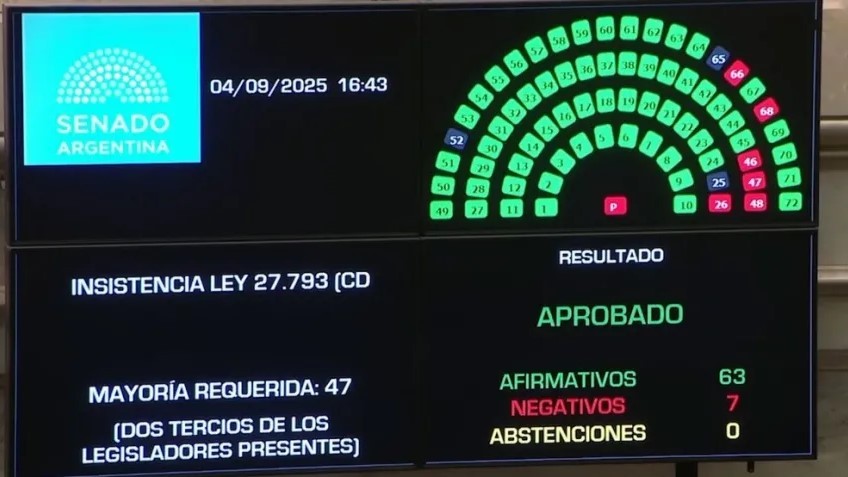 El Senado aprobó este jueves 4 de septiembre el rechazo al veto presidencial del proyecto que declara la emergencia en el área de Discapacidad, que volvió a tener vigencia pese a la resistencia del Gobierno Nacional. La aprobación se dio por amplia mayoría opositora, con 63 votos a favor y sólo 7 en contra.