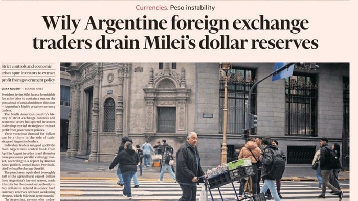 "El fracaso de Milei ha inquietado a los inversores". "El fracaso de Milei en acumular reservas ha inquietado a los inversores en las últimas semanas e impulsado a una liquidación de activos argentinos", dice el artículo. El cambio de actitud de los ahorristas, plantea la nota, se profundizó tras una serie de medidas del Banco Central que reimplantaron controles y restricciones cambiarias.
